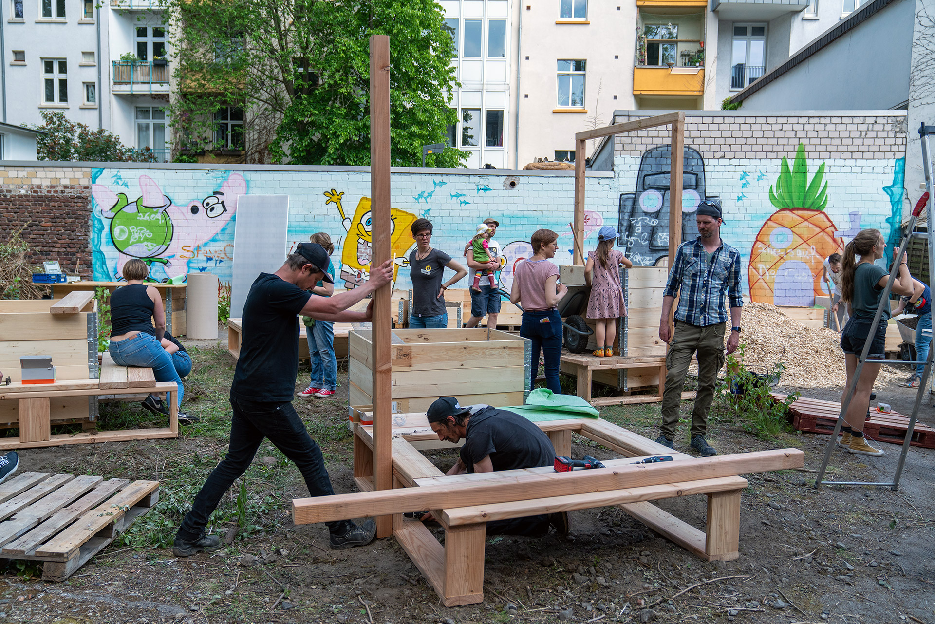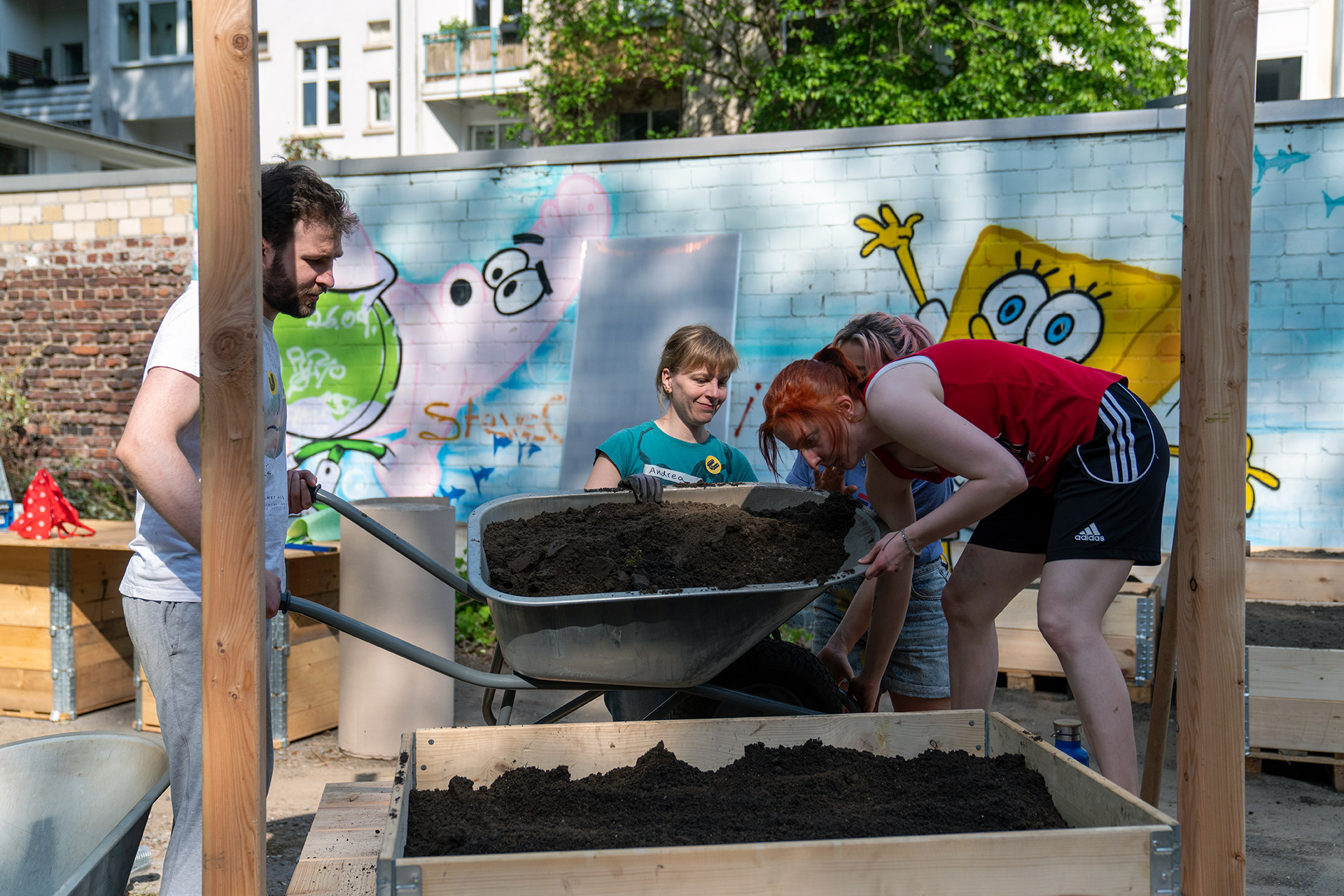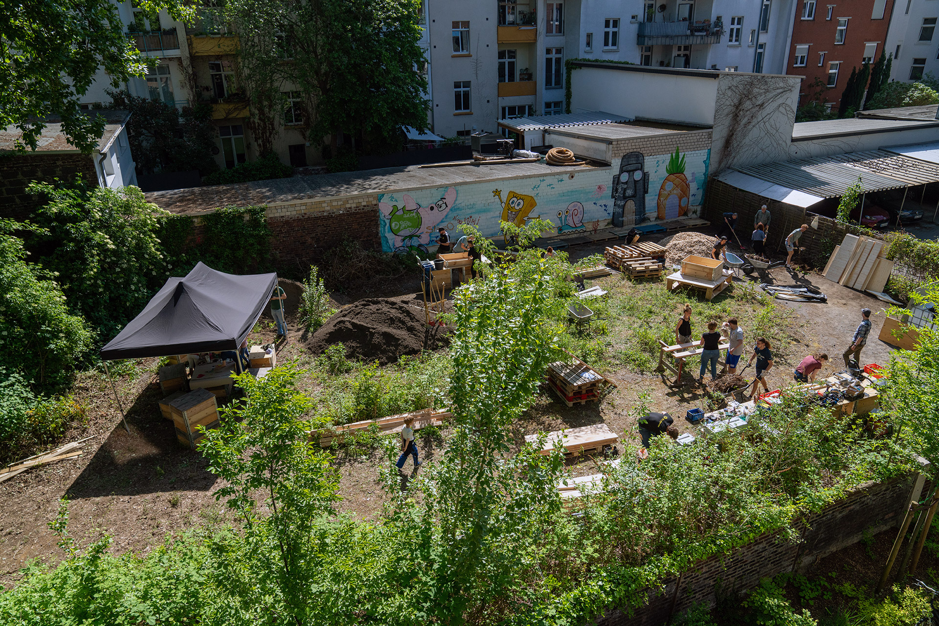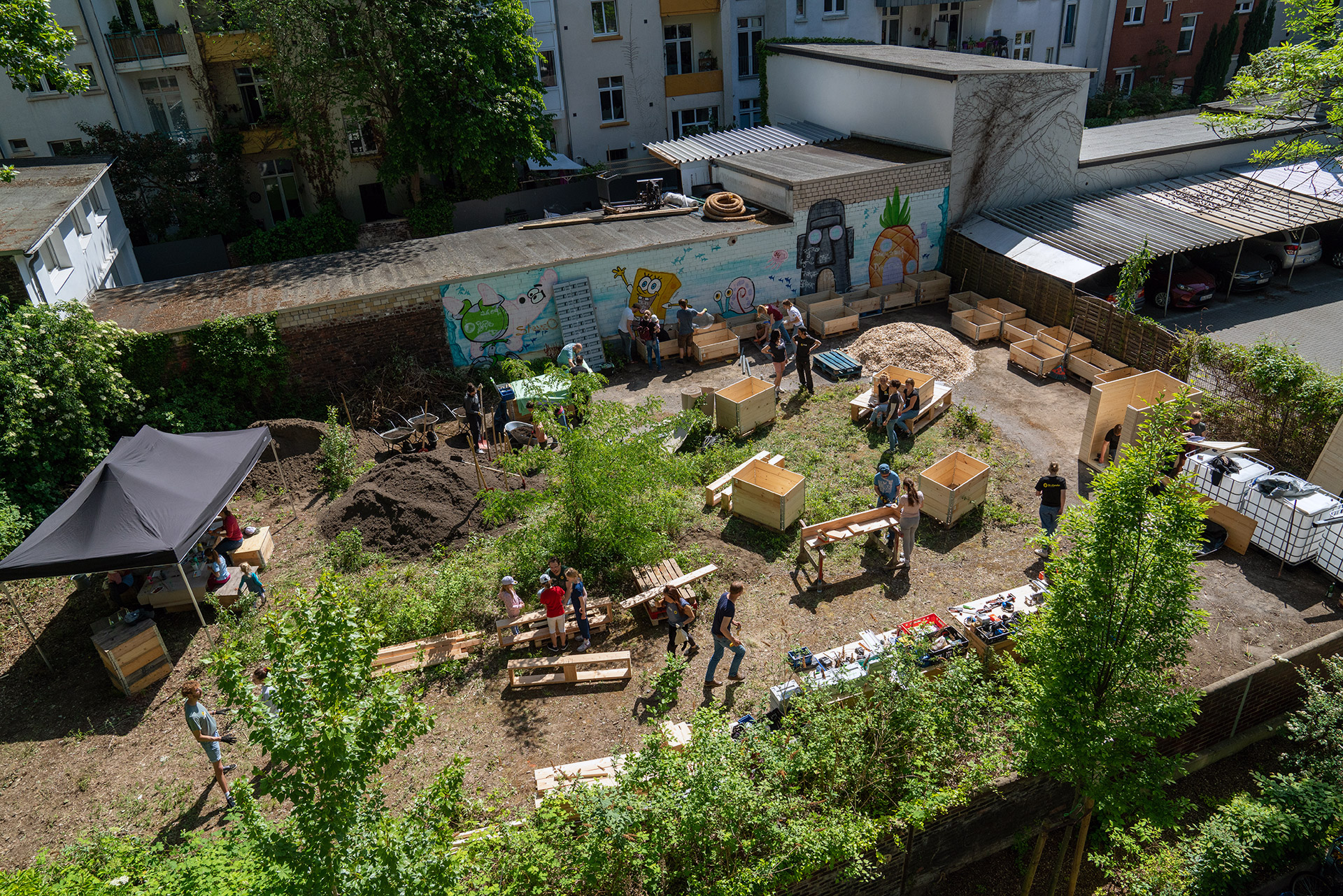Der 14. Mai 2022 war für alle Eichhörnchen und Vögel der Barmer Straße ein durchaus außergewöhnlich spannender Tag: Lässig auf den schattigen Ästen der großen alten Bäume des bis dato ungenutzten Hinterhofes sitzend, konnten sie beobachten wie dieser sich mit der Hilfe dutzender Helfer*innen – ca. 70 Menschen insgesamt – in einen urbanen Nachbarschaftsgarten verwandelt. Ein Spektakel sondergleichen – für die Nachbar*innen und die Urbanisten war es das Ergebnis eines mehrjährigen Prozesses. Nachdem sich dieses Frühjahr alle rechtlichen und finanziellen Fragen geklärt hatten, konnte es endlich an den lang ersehnten Bau des Gartens gehen.