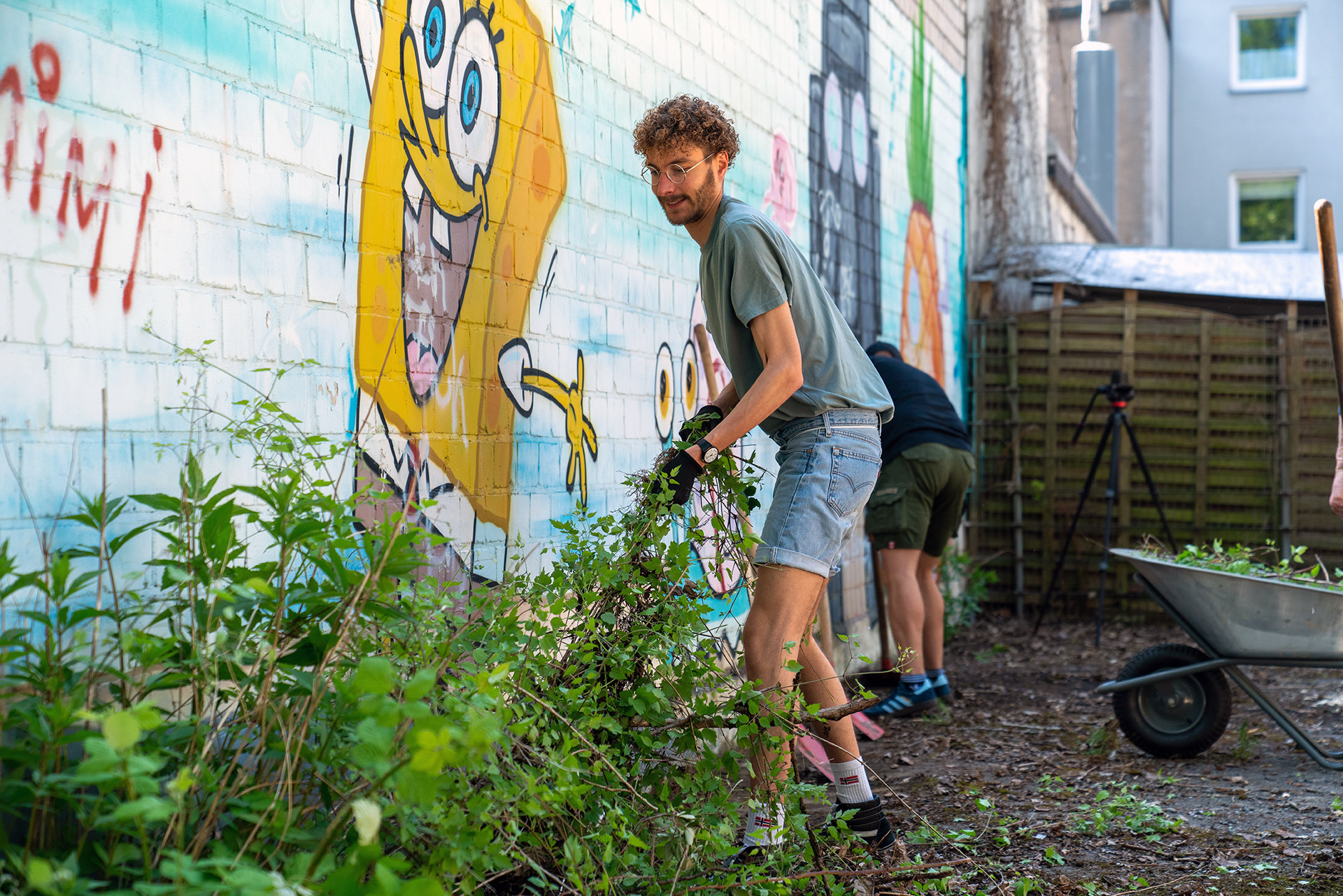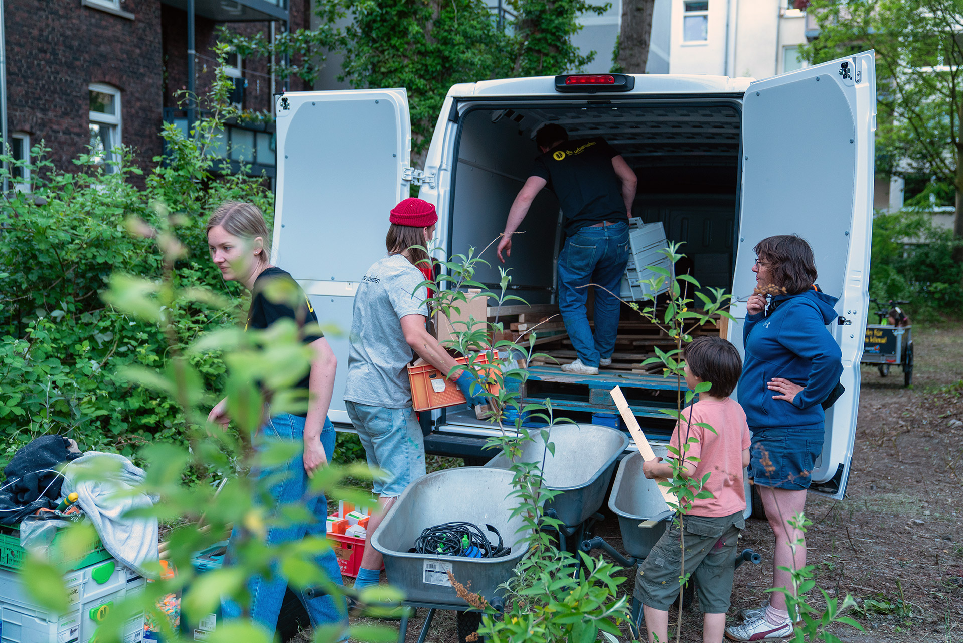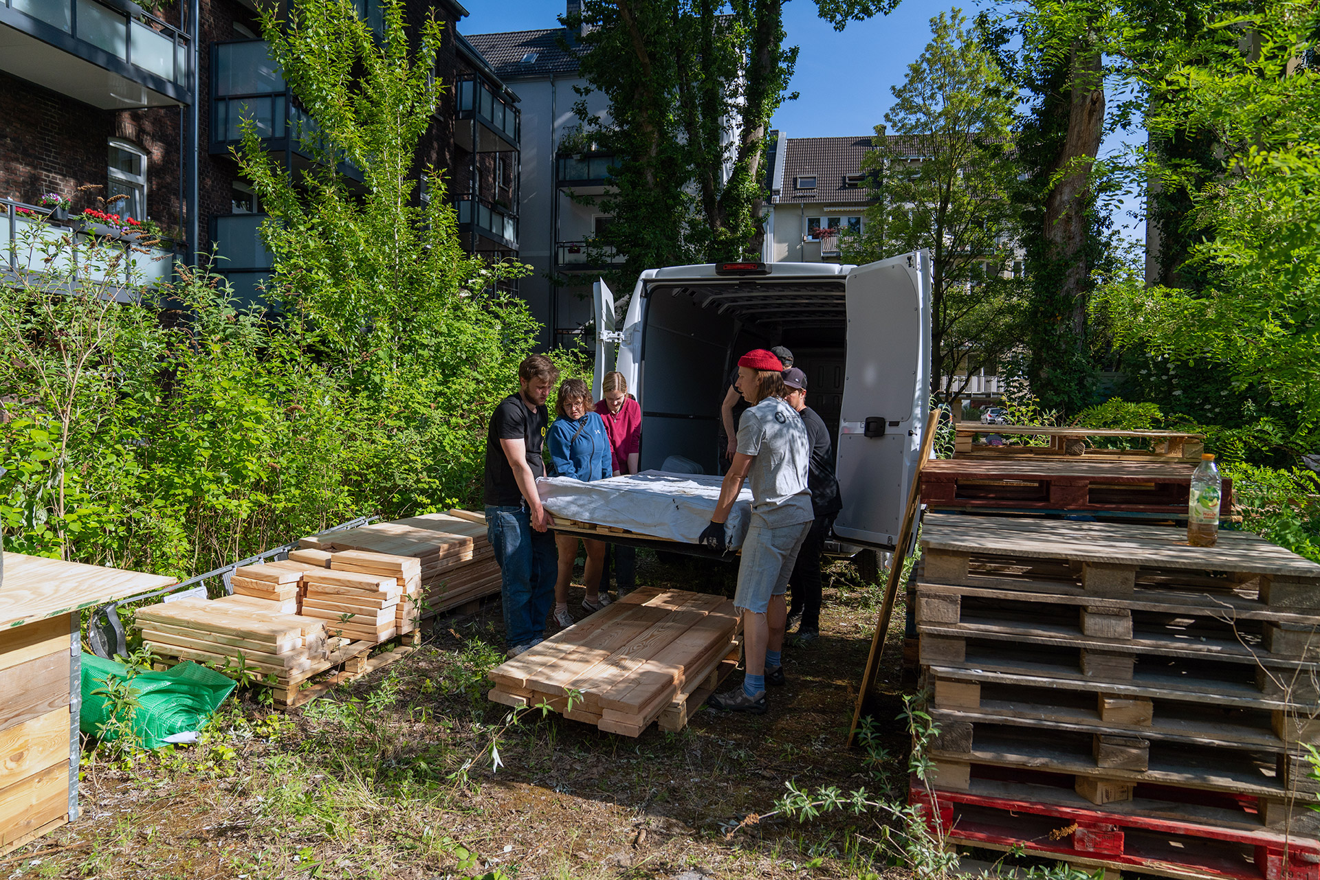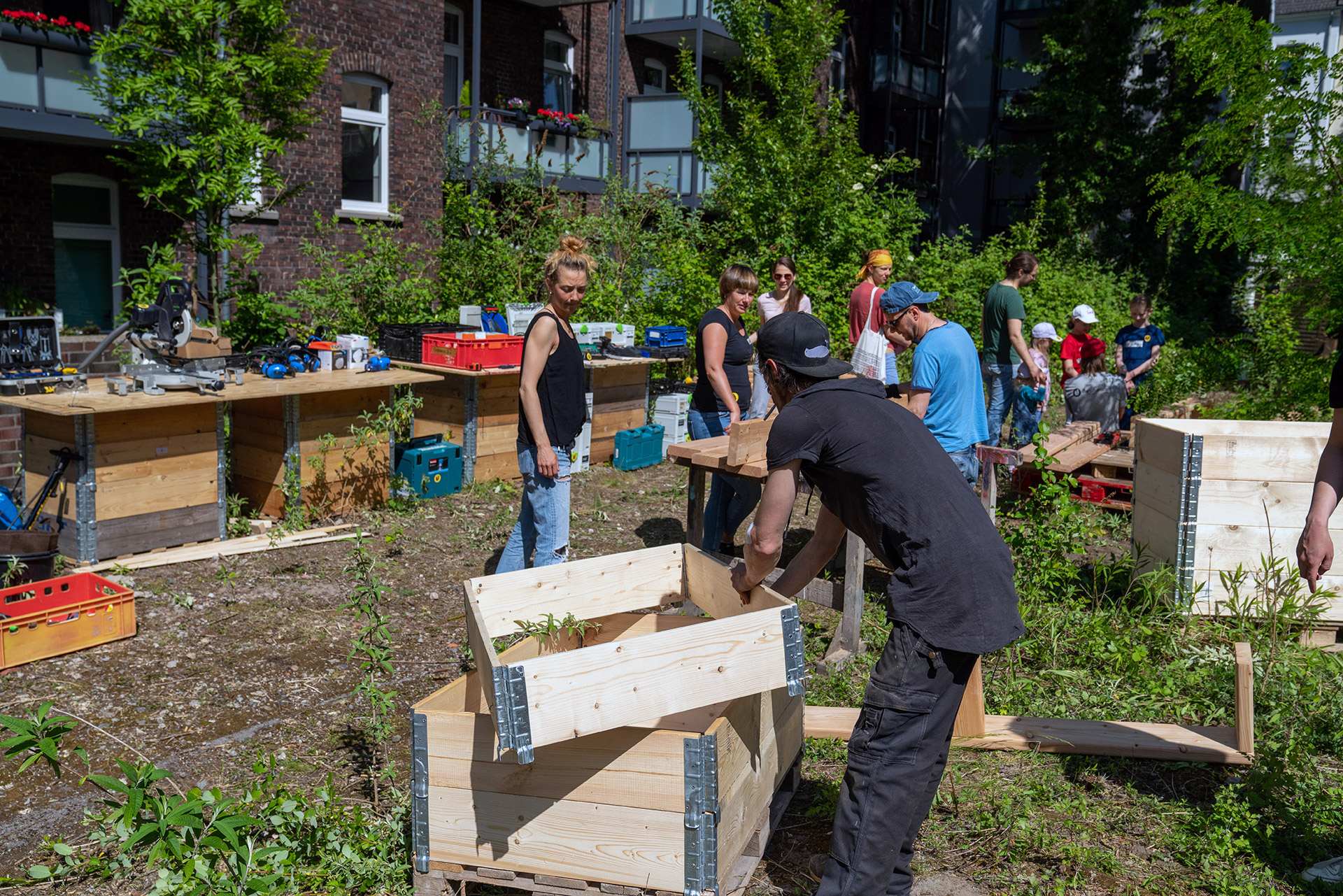 Der 14. Mai 2022 war für alle Eichhörnchen und Vögel der Barmer Straße ein durchaus außergewöhnlich spannender Tag: Lässig auf den schattigen Ästen der großen alten Bäume des bis dato ungenutzten Hinterhofes sitzend, konnten sie beobachten wie dieser sich mit der Hilfe dutzender Helfer*innen – ca. 70 Menschen insgesamt – in einen urbanen Nachbarschaftsgarten verwandelt. Ein Spektakel sondergleichen – für die Nachbar*innen und die Urbanisten war es das Ergebnis eines mehrjährigen Prozesses. Nachdem sich dieses Frühjahr alle rechtlichen und finanziellen Fragen geklärt hatten, konnte es endlich an den lang ersehnten Bau des Gartens gehen.