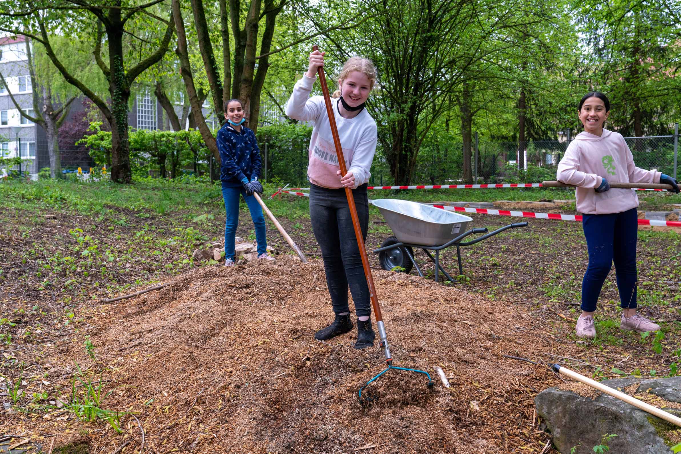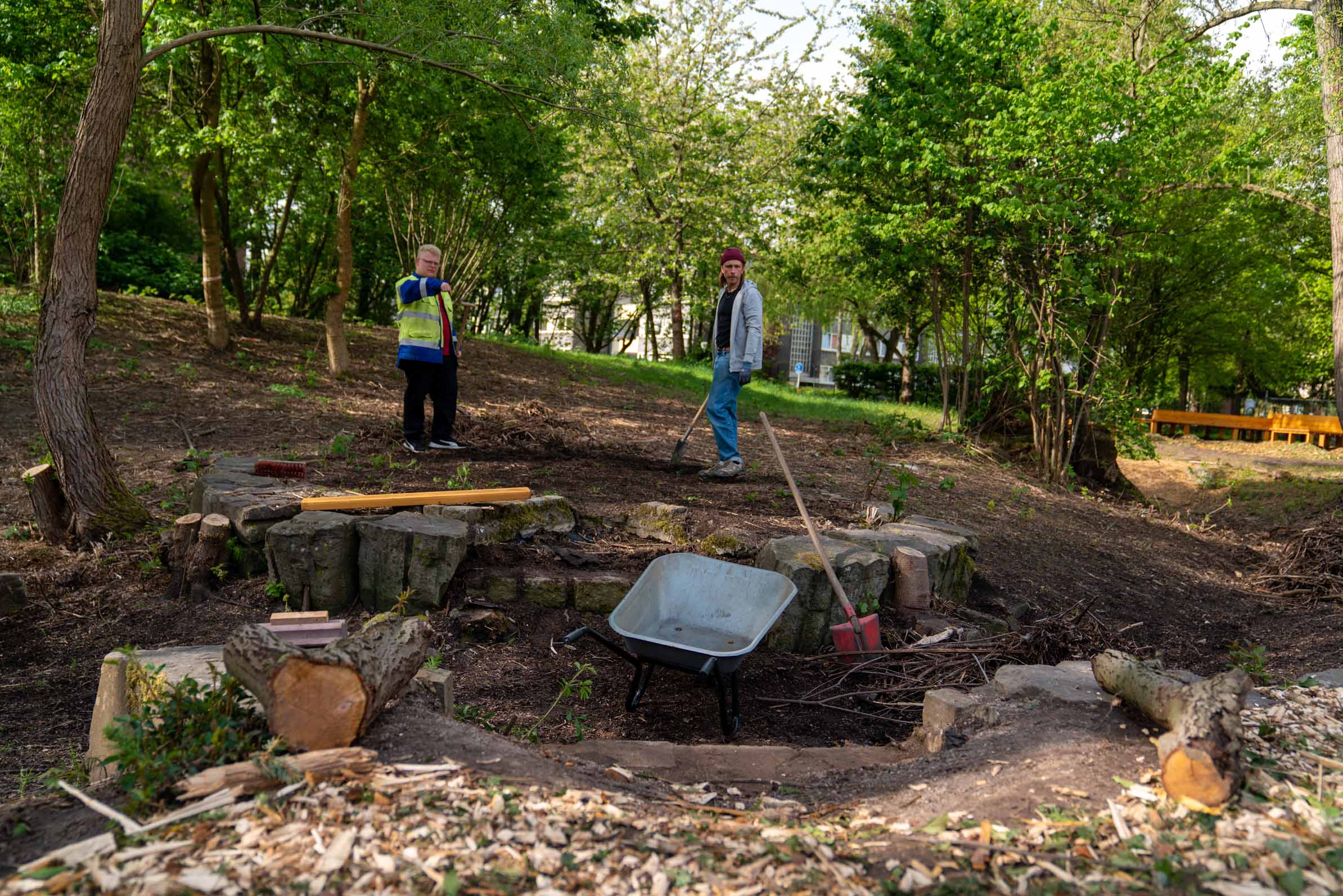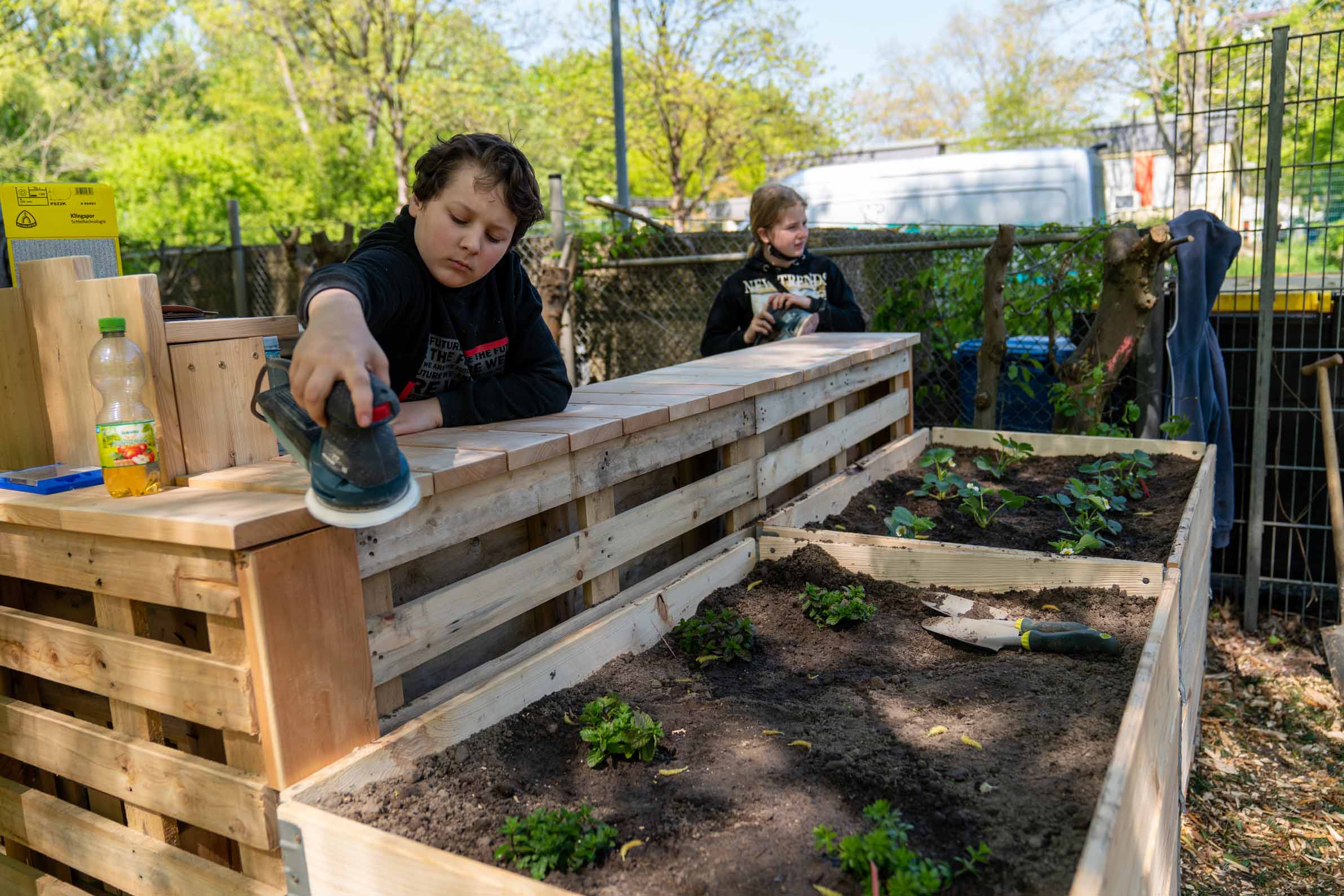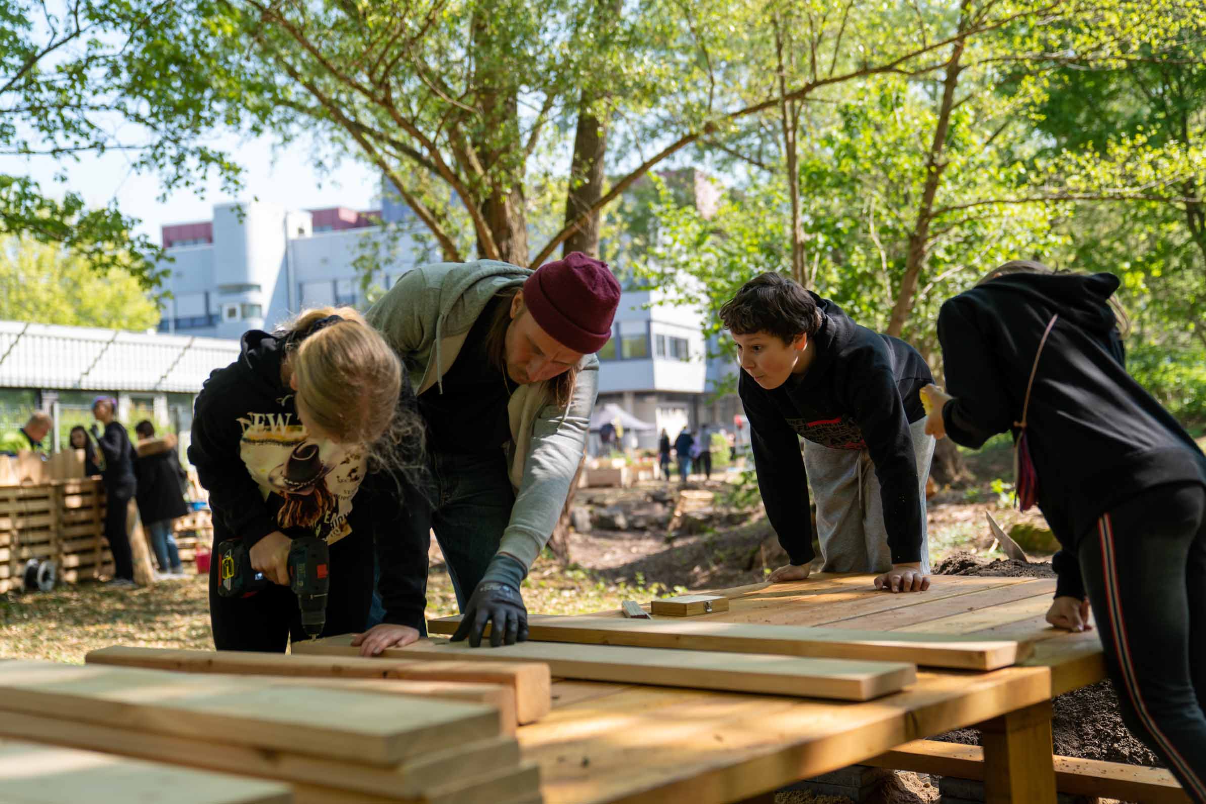 Nach den Osterferien wurde der Garten in einer fünftägigen Bauwoche realisiert. Rund 30 Schüler*innen arbeiteten in verschiedenen Teams an Hochbeeten, Möbeln, Fundamenten und Wegen. Nach kurzen Einweisungen übernahmen sie zunehmend eigenständig Aufgaben und gaben ihr Wissen gegenseitig weiter. Neben handwerklichen Fähigkeiten standen Teamarbeit, Kommunikation und Verantwortungsübernahme im Mittelpunkt.