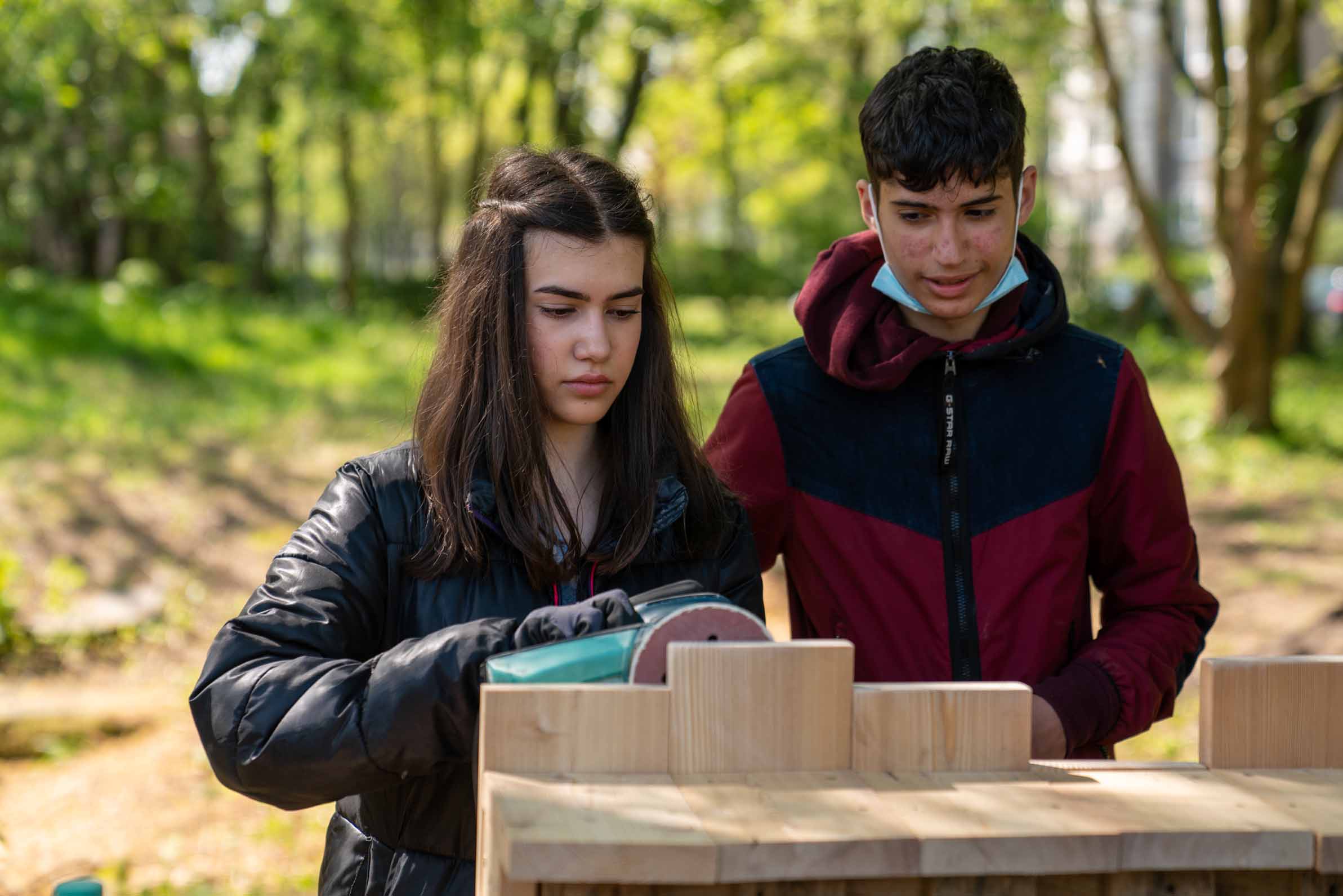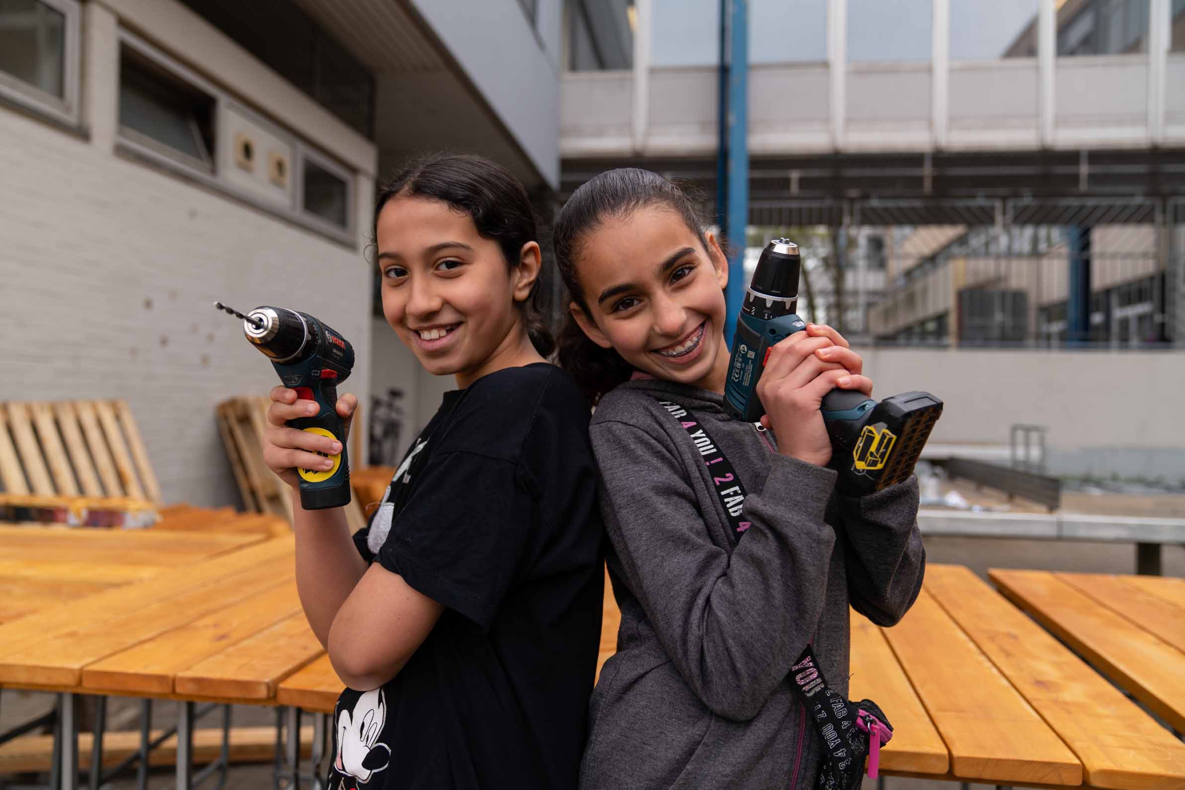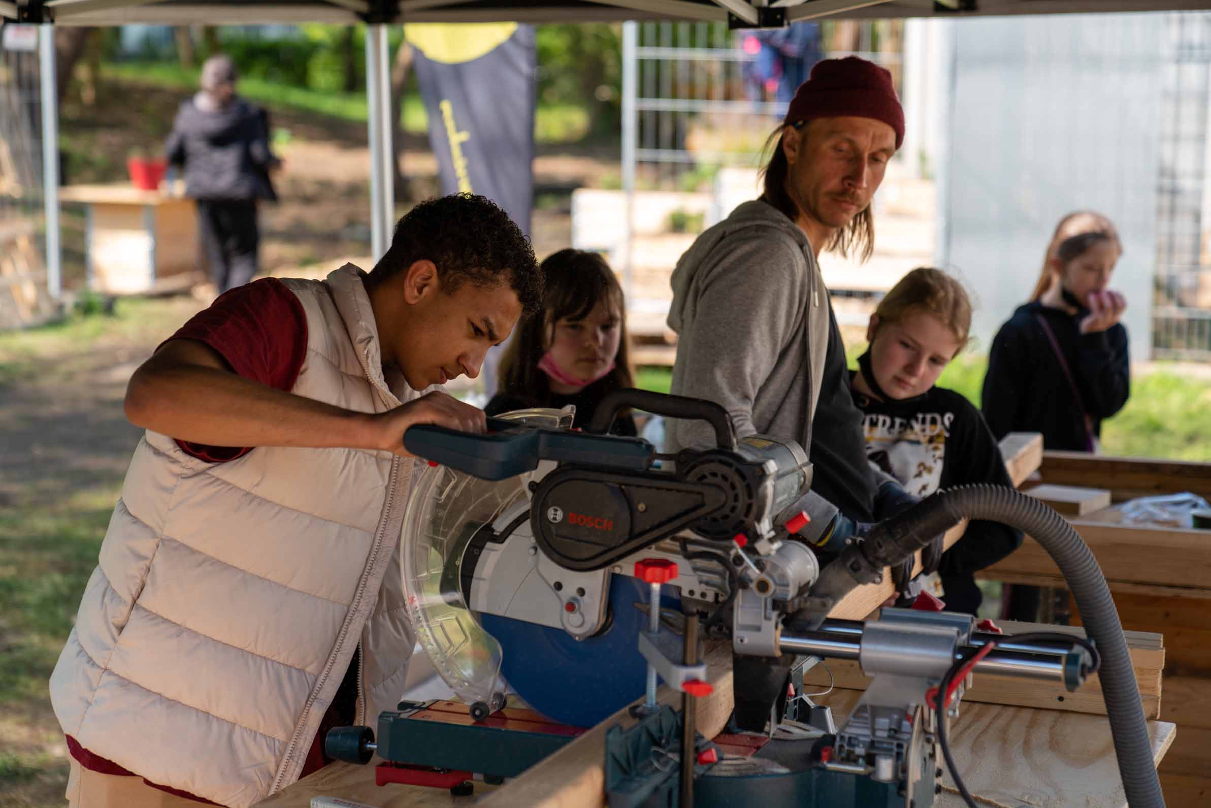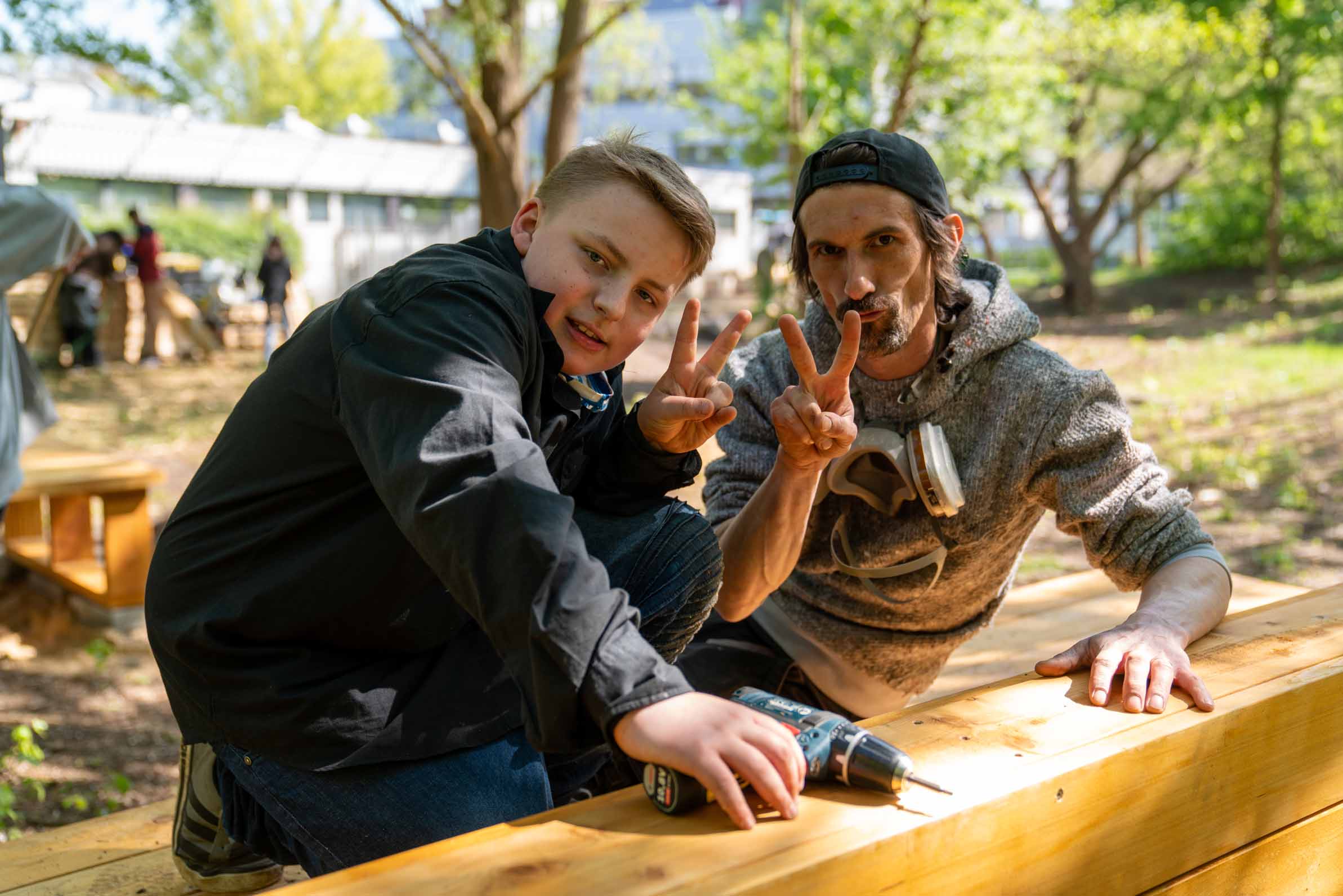 Nach den Osterferien wurde der Garten in einer fünftägigen Bauwoche realisiert. Rund 30 Schüler*innen arbeiteten in verschiedenen Teams an Hochbeeten, Möbeln, Fundamenten und Wegen. Nach kurzen Einweisungen übernahmen sie zunehmend eigenständig Aufgaben und gaben ihr Wissen gegenseitig weiter. Neben handwerklichen Fähigkeiten standen Teamarbeit, Kommunikation und Verantwortungsübernahme im Mittelpunkt.