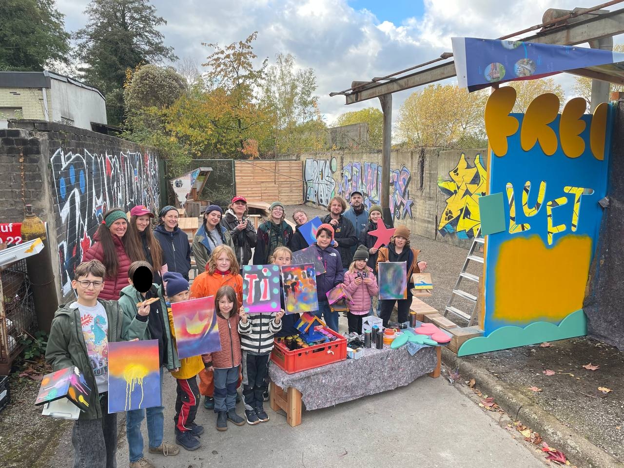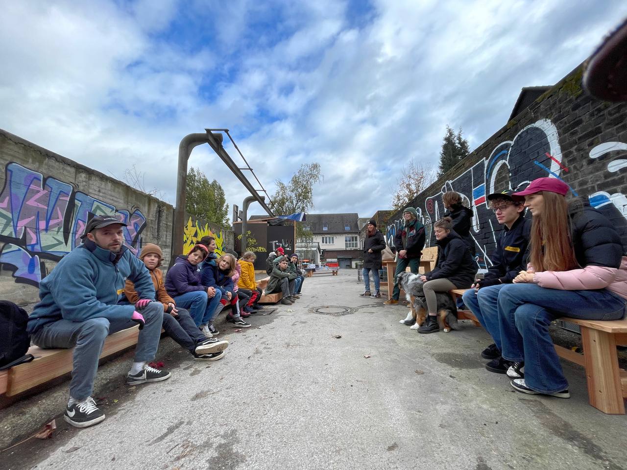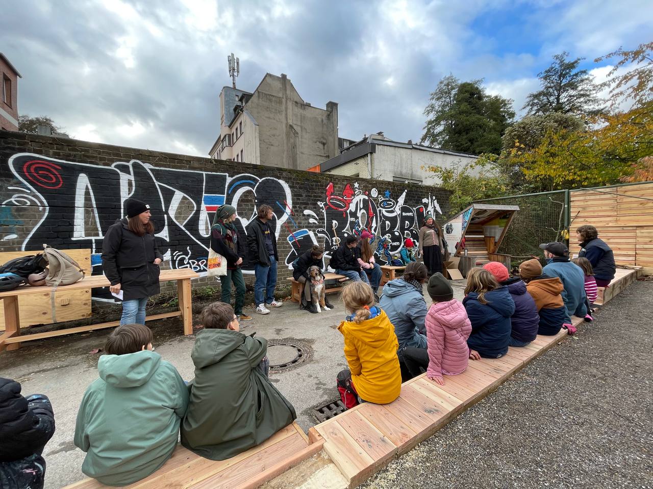 Vom 21.–24. Oktober kamen zahlreiche junge Menschen sowie Workshopleitende zusammen, um die Fläche neu zu gestalten. In täglich wechselnden Bautrupps wurden u. a. Sitzmöbel, eine lange Sitzumrandung und kleine Elemente für die Naturpädagogik gebaut. Parallel entstanden kreative Gestaltungen und erste Strukturen für zukünftige Workshops.